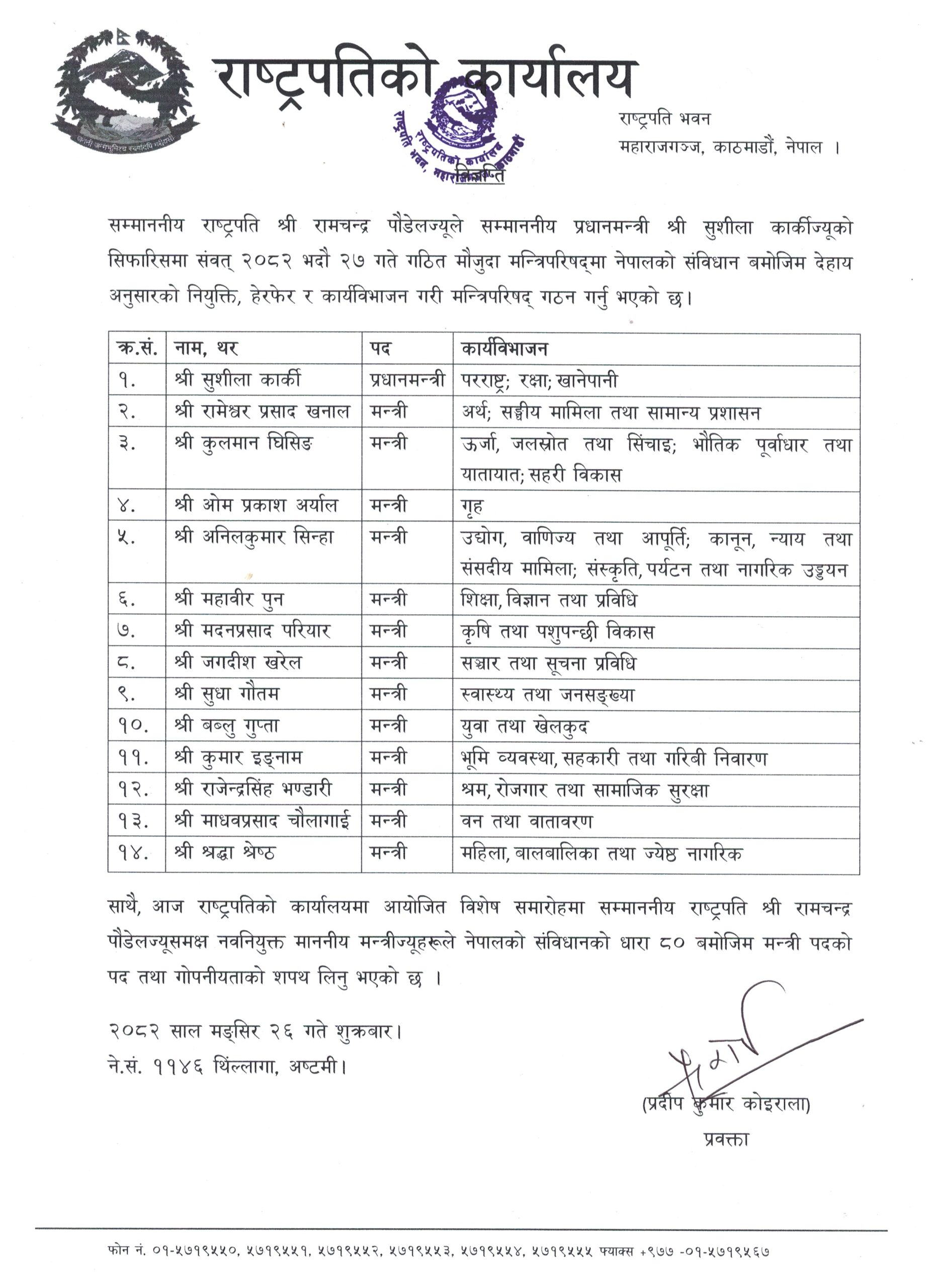 प्रधानमन्त्री कार्कीले परराष्ट्र, रक्षा तथा खानेपानी मन्त्रालयको जिम्मेवारी भने आफैंसँग राखेकी छन् । थप गरिएका मन्त्रीहरूमध्ये इङ्नाम कानुनका प्राध्यापक हुन् भने चौलागाई कर्णालीबासी, भण्डारी पूर्व एआइजी, श्रेष्ठ पर्यटन बोर्डकी कर्मचारी हुन् ।