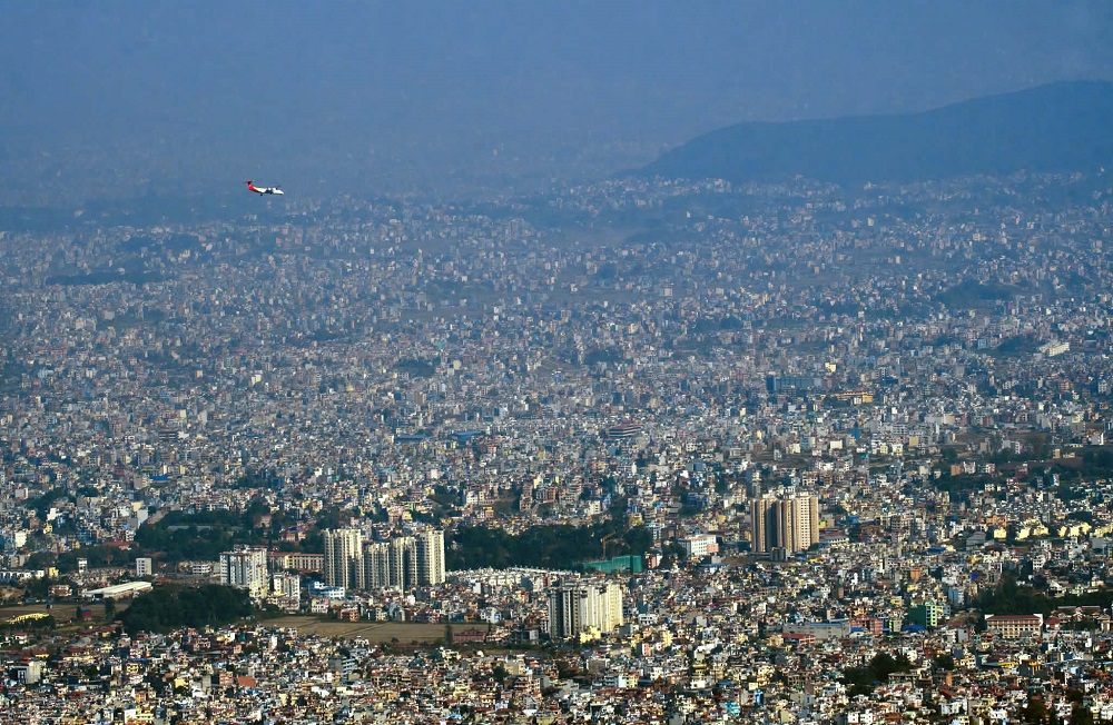 घरैघरको महासागरमाथि आकाश चिर्दै उडिरहेको विमान र दक्षिणकाली नगरपालिकाको हात्तीवनबाट देखिएको काठमाडौं सहर